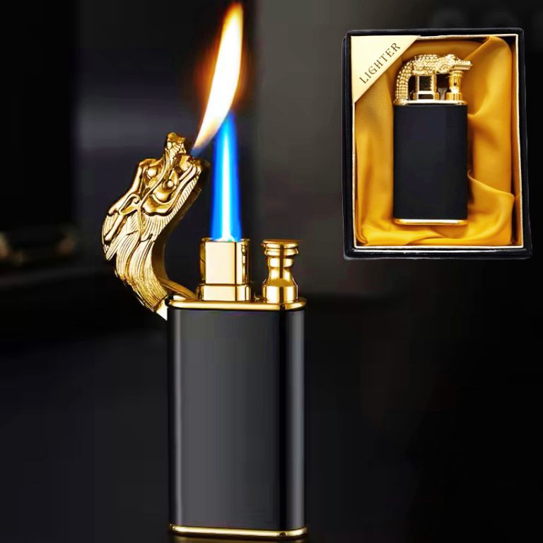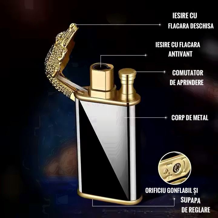 Ceea ce are in plus aceasta bricheta este atat iesirea flacarei simple, cat si iesirea cu flacara antivant. Prima flacara libera iese din gura dragonului si amplifica ideea ca un dragon sufla foc.